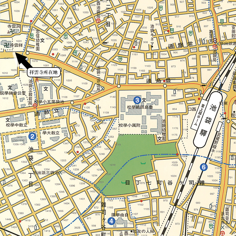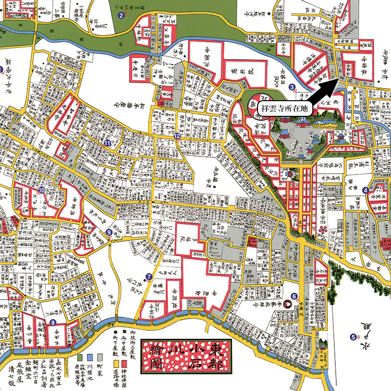 寛永13年(1636年)、金杉村もまた武家用地となってしまったため、当寺は戸崎台へ移転することになりました。そこは現在の文京区白山二丁目あたりで、館林候の御殿と地続きにあり、水戸候の後楽園にもほど近い立地。拝領地5770坪・町家1929坪の境内には池や築山が配され、将軍が休憩されたと伝わる老松は、幕府の資金で手入れされていました。 このほか、稲荷社の側にあった大日如来石座像は目を病んだ人の参詣が絶えず、客殿に安置されていた聖徳太子像も多くの信者を得て、大祭日には大いに賑わったと言います。このように戸崎台の祥雲寺は江戸名所の一つに数えられ、「江戸名所図絵」にも記される有名な寺でした。