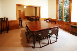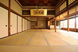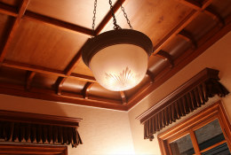 伝統的な洋館建築で、法事の控え室や休憩室として使われています。皇族の印・菊模様をモチーフにしたランプや、アーチ型の飾り窓に、外国文化が花開いた大正・明治の華やかな暮らしぶりが映し出されるようです。